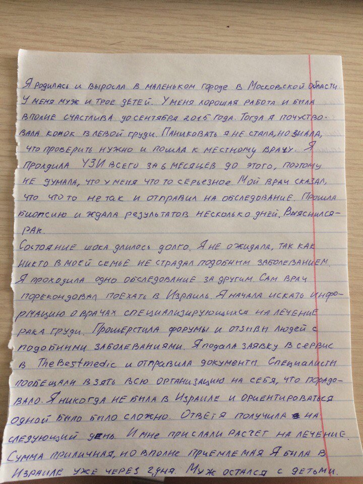 Добрый день! Я бы хотела поделиться впечатлениями от сотрудничества с компанией tlv.hospital. Как и другие, обратилась в Зебест из-за того, что долгое лечение в наших больницах так и не дало положительного результата. Как то в интернете наткнулась на отзывы про лечение в Израиле. Писали, что помогают даже тем больным, которым у нас добрые врачи подписали приговор… конечно страшно было, думала, может это все обман лечение в Израиле… А потом поняла, что терять мне нечего и позвонила в tlv.hospital. Отдельное беспокойство было про то, что раньше я никогда не выезжала за пределы нашей страны. У меня и загранпаспорта то не было… Консультант по имени Константин сразу меня успокоил, что документы он сделает без проблем. А еще он отослал мои результаты в клинику в Израиле, и мне дали положительный ответ, что меня возьмутся лечить, что все не так печально. Что очень важно, мне предварительно сказали, сколько все это будет приблизительно стоить – с перелетом, проживанием, питанием и лечением. Признаюсь, ожидала услышать большую цифру. Через 10 дней я уже была в клинике. Рядом всегда находилась Аня, девушка от Зебестмедика, она переводила все, что было не ясно, помогала во всех вопросах. Но самое главное, что теперь мне гораздо лучше. Мой путь к выздоровлению только начат, но прогнозы очень хорошие. Жалею, что раньше не обратилась сюда. И всем хочу сказать: не верьте тем, кто говорит, что у вас нет шансов. Шансы всегда есть!